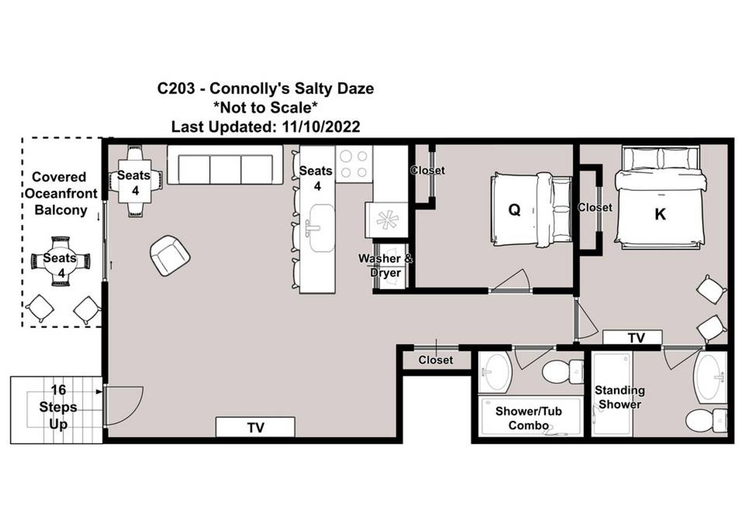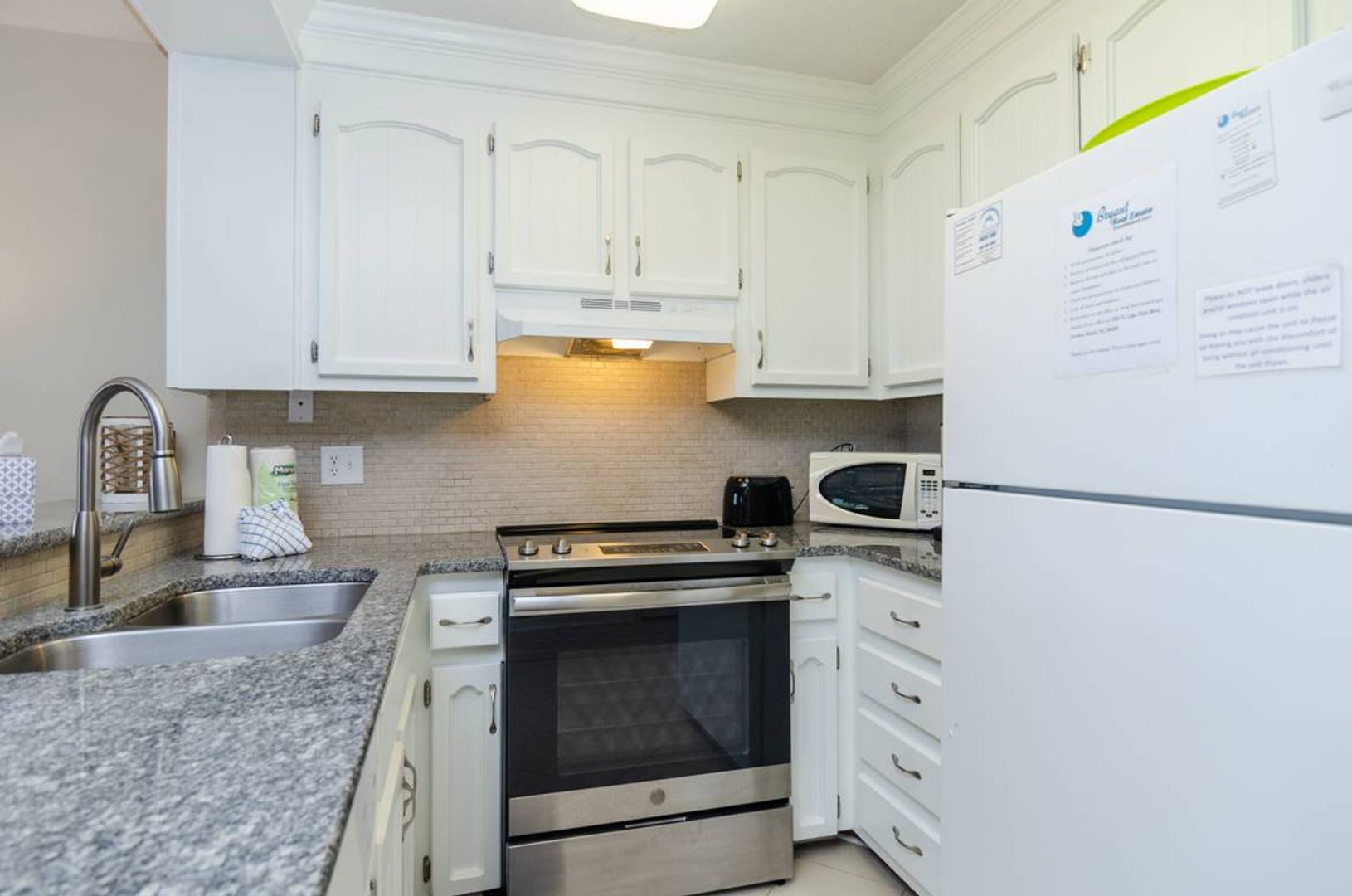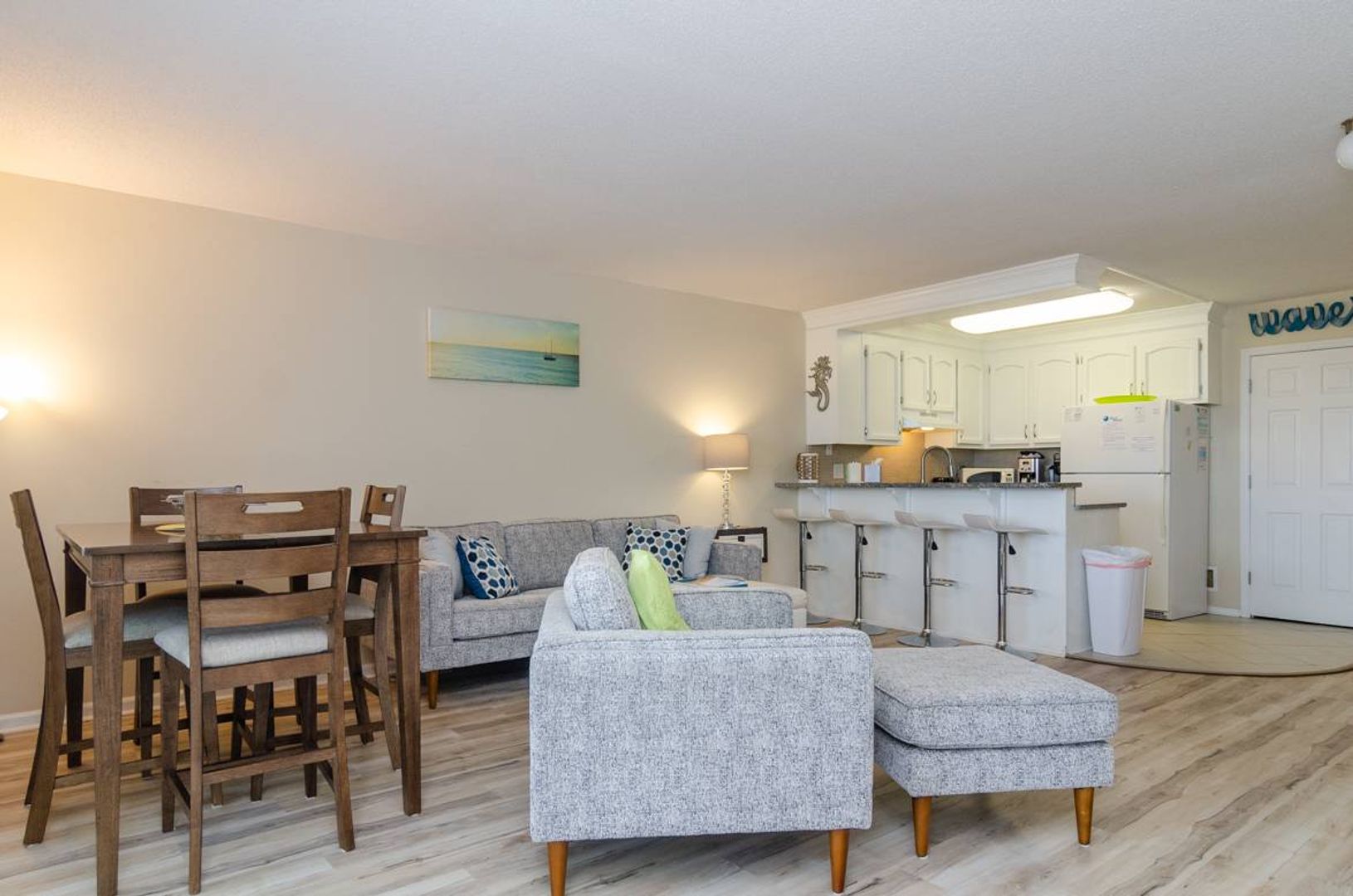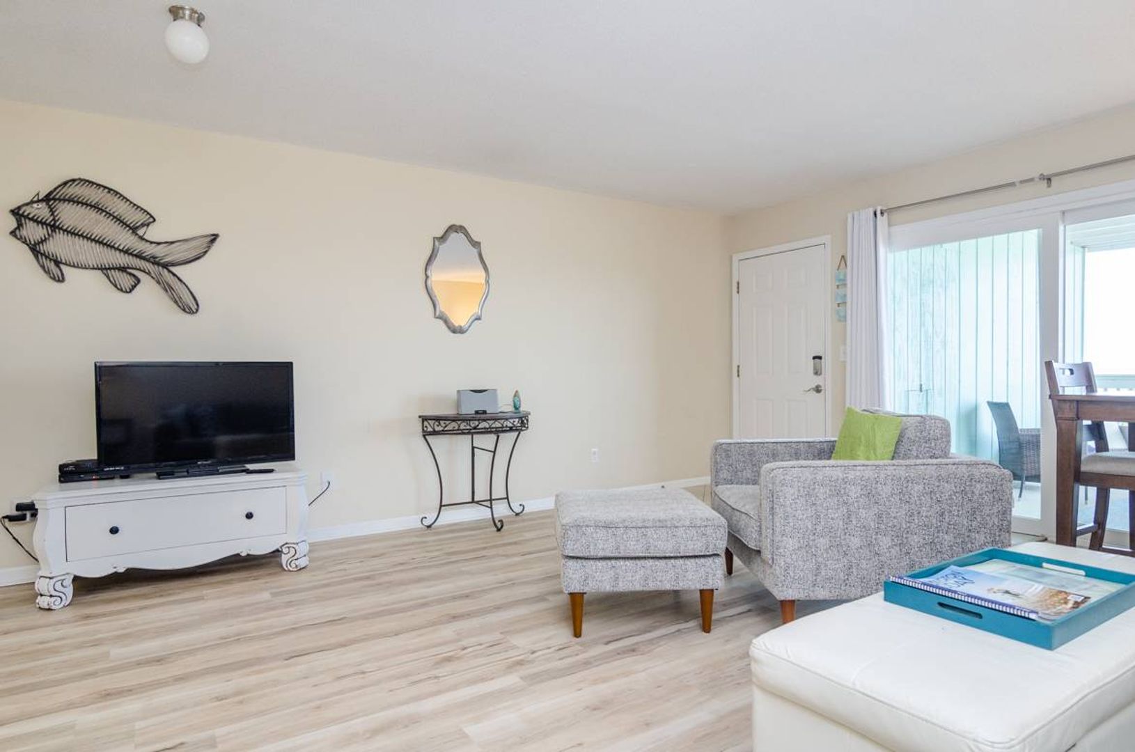 This first floor condo at Dunes II features a large combination kitchen and living room, plus a covered balcony. Recently remodeled, "Connally's Salty Daze" has two bedrooms and two full baths - one bedroom with a King bed, and one with a Queen. The unit features WiFi with live streaming through Hulu Live instead of cable TV. There is private beach access directly behind the building.