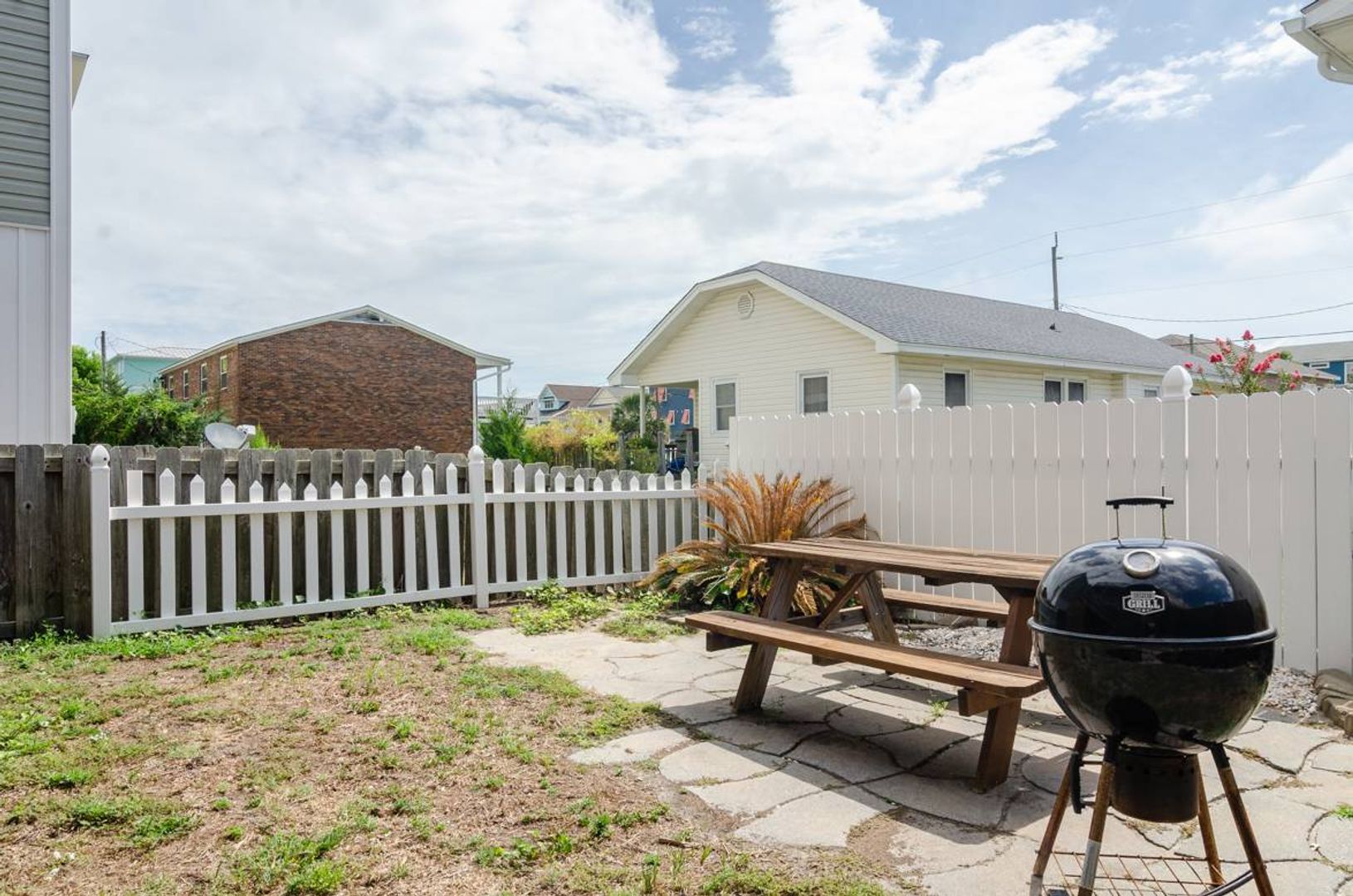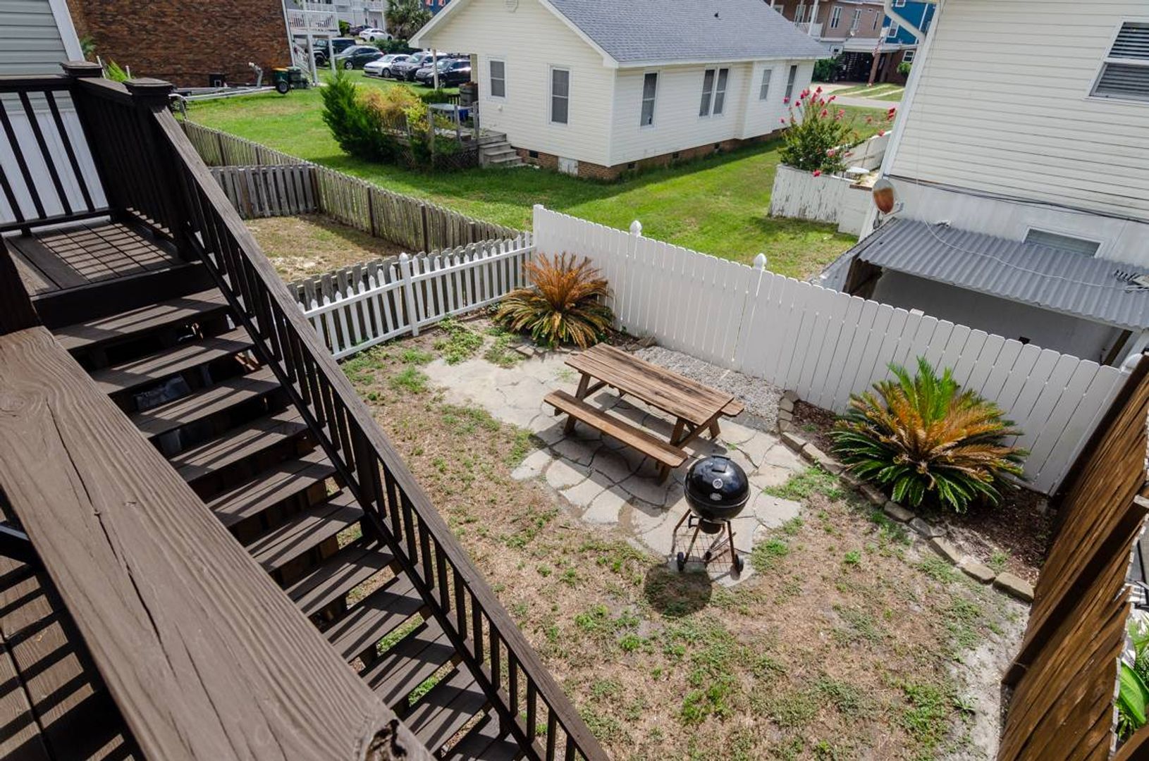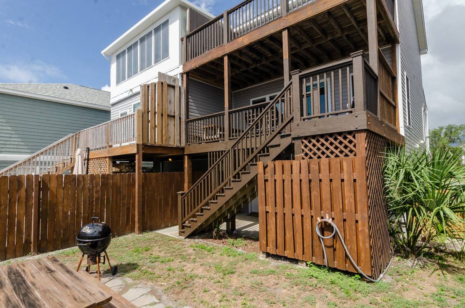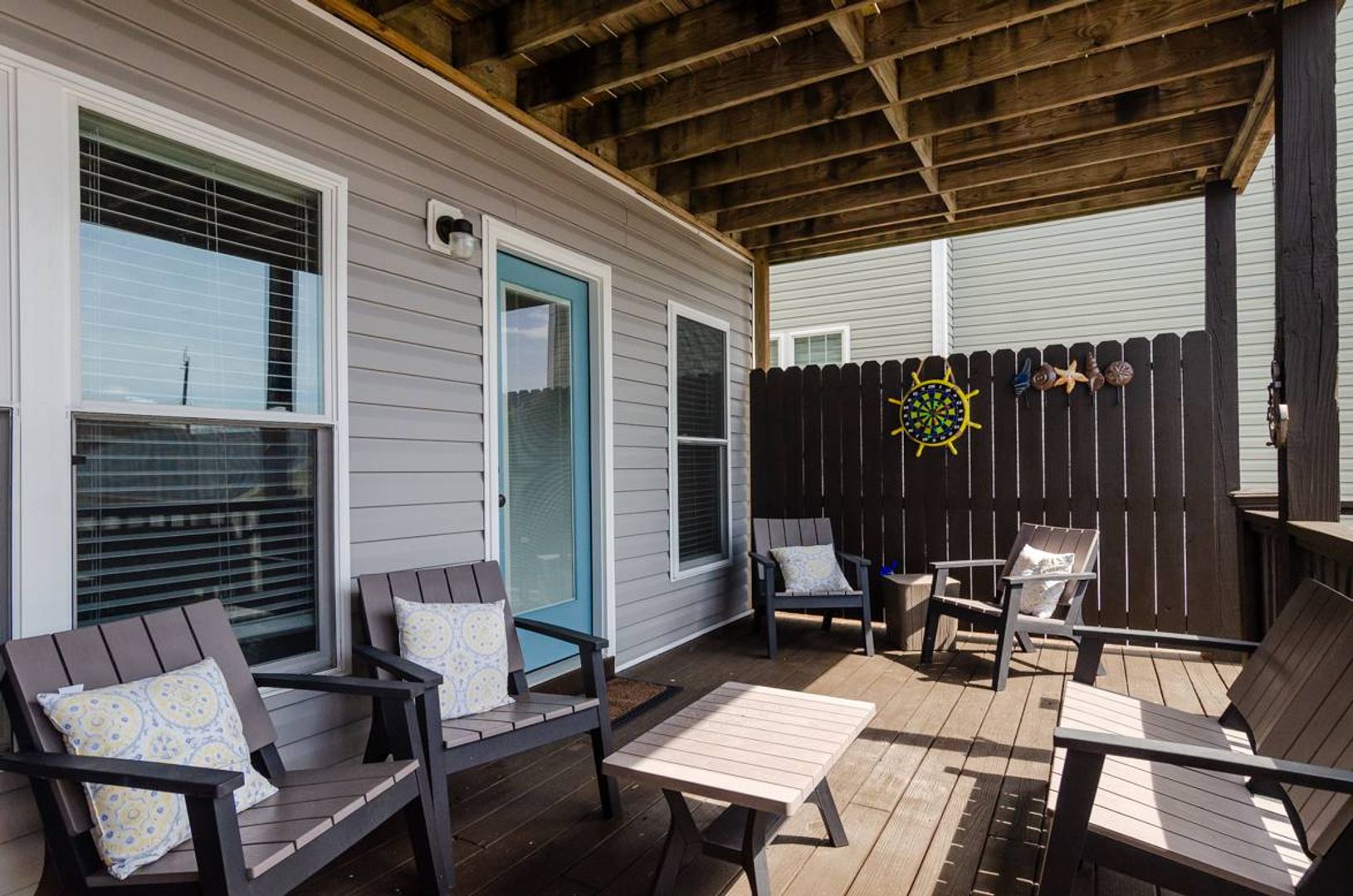 This 3-story townhome is just a short walk to the ocean. With 4 bedrooms, 4 bathrooms, ample space to spread out, this updated home is sure to check all your boxes. The ground level is extremely versatile and offers a pyramid bunk bed with a twin over a queen bed, a stand-alone queen bed, and a futon sitting area that overlooks the television. There is a full bathroom attached to this suite. Outside you will find a fully fenced backyard which makes this home ideal for pets! Enjoy grilling out in the evenings and dining at the picnic table. Upstairs you are welcomed by the gracious open floor plan that creates a wonderful family room. The beautifully updated kitchen is well stocked and will surely make meal preparation a breeze. There is also a guest room on this living level that offers a cozy queen-sized bed and access to a full bathroom. The third floor of this home houses the spacious primary suite which includes a plush king-sized bed, private un suite bathroom, and access to the deck. The deck shared access with the nearby queen guest room.